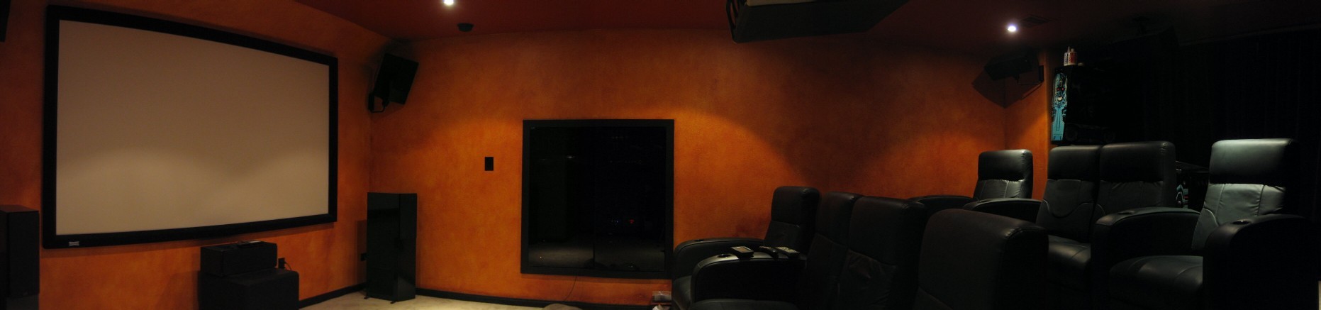 Here is another panormaic picture of Carl's movie theater after a recent paint job. Now the front wall and ceiling are flat black, while the side and back walls are a very nice, dark blue.